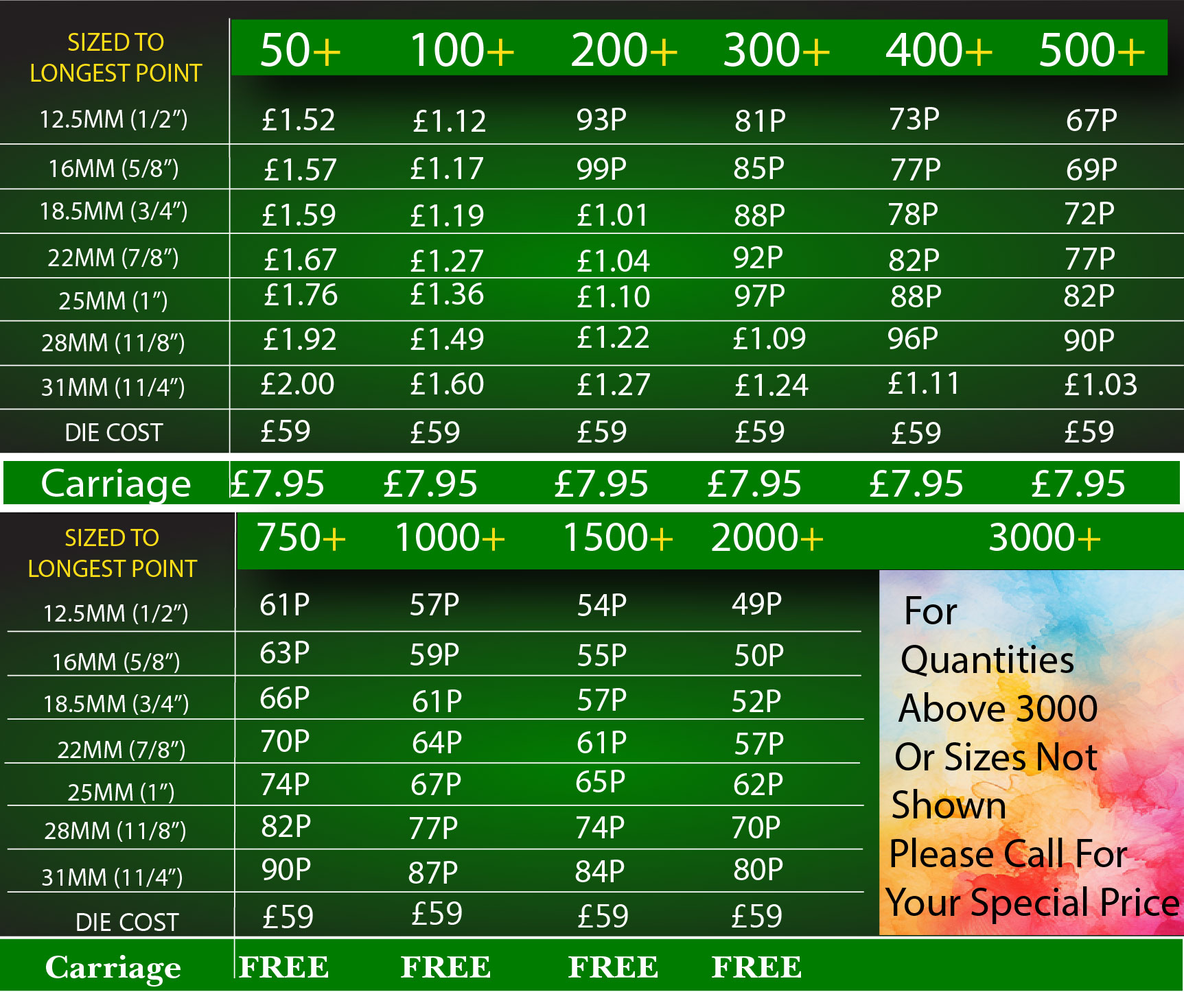 Prices exclude VAT For larger sizes & quantities please call or email for a quotation